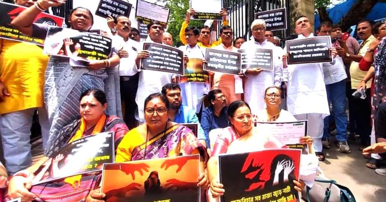 भाजपा विधायक धरने पर बैठे, महिला सुरक्षा पर सदन में बात करने की मांग