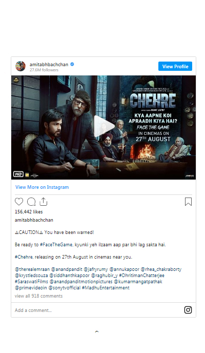 নিজের সোশ্যাল মিডিয়া হ্যান্ডেলে এই খবর শেয়ার করেছেন স্বয়ং অমিতাভ বচ্চন। একটি ক্লিপিংস শেয়ার করে তিনি লিখেছেন, “সাবধান। খেলা শুরু হয়ে গিয়েছে। সেই খেলার মুখোমুখি হতে তৈরি থাকুন। এই দোষের দায়ভার কিন্তু আপনার উপরেও বর্তাতে পারে। আপনার নিকটবর্তী প্রেক্ষাগৃহে আসছে চেহরে।”